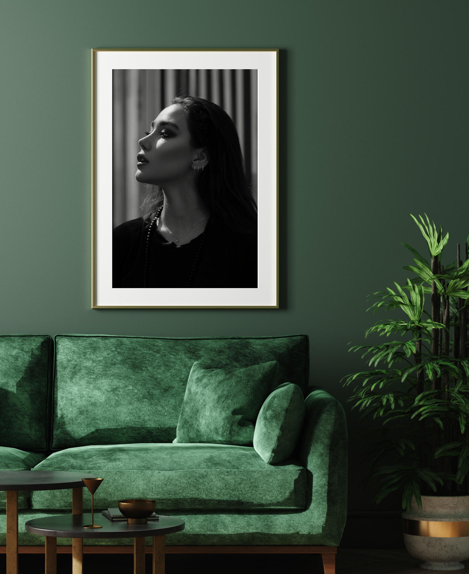 Plakat Spojrzenie z kolekcji SHE, czyli niezwykłe i nietypowe portrety kobiet przedstawiające ich tajemniczość, zmysłowość i piękno. Jak zwykle monochromatyczna czarno – biała fotografia daje najlepsze efekty.
