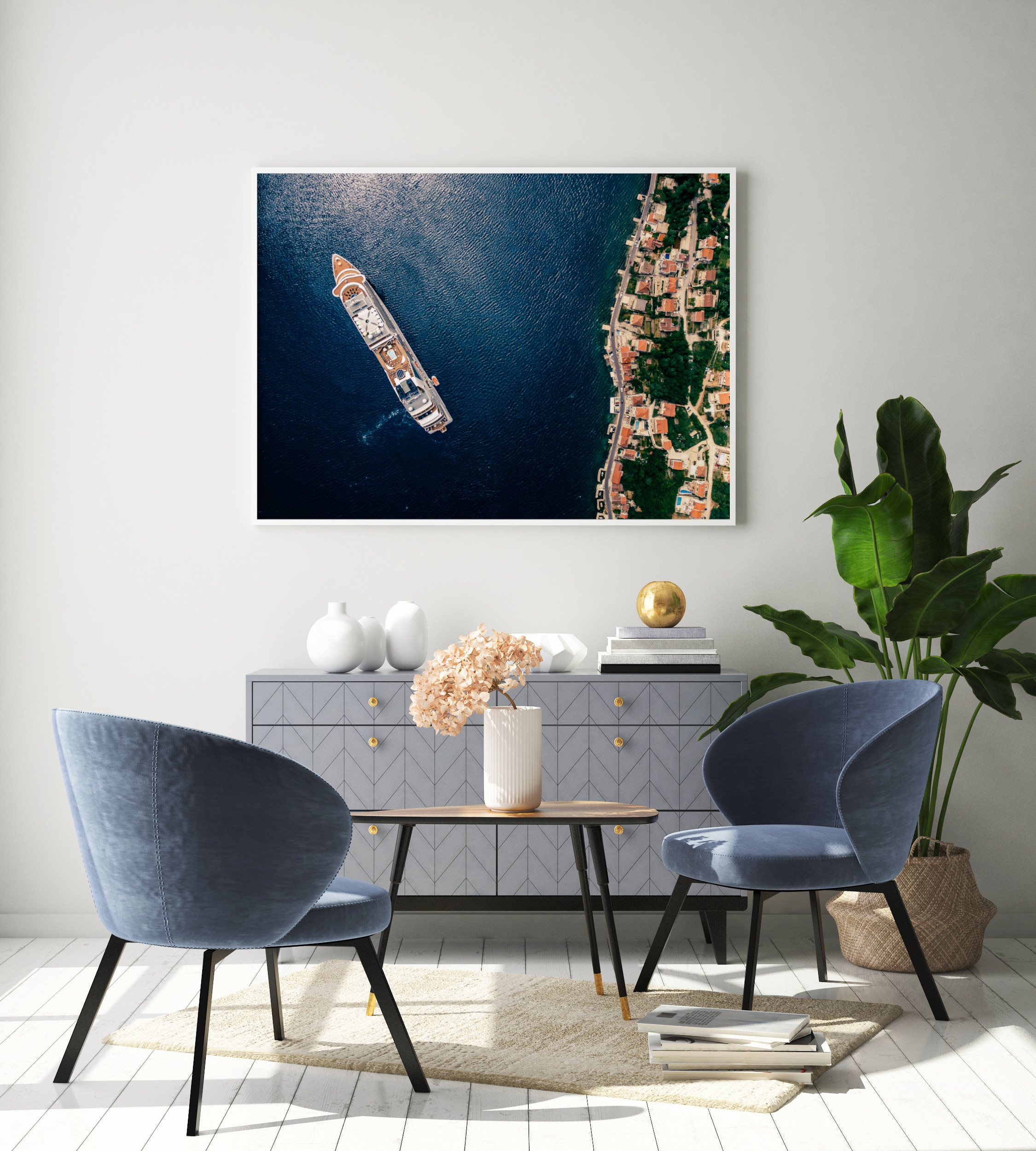 Plakat Statek na morzu to fantastyczny i nietypowy kadr statku – z tej perspektywy prezentujący się wyjątkowo niebanalnie. Doskonała kolorystyka i ciekawa forma na jednym ujęciu tworzą piękną kompozycję. Plakat dla miłośników morza, żeglugi i wakacyjnych rejsów.